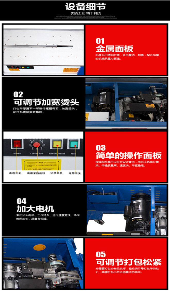 在插入包裝帶后,機(jī)器能自動(dòng)完成聚帶、熱合、切斷、并出帶的捆扎過程;且有自動(dòng)停機(jī)之功能;打包機(jī)是使用打包帶纏繞產(chǎn)品或包裝件,然后收緊并將兩端通過熱效應(yīng)熔融或使用包扣等材料連接的機(jī)器,其工作速度快、效率高、省時(shí)省力、捆扎質(zhì)量高。保證包件在運(yùn)輸、貯存中不因捆扎不牢而散落,同時(shí)還應(yīng)捆扎整齊美觀。